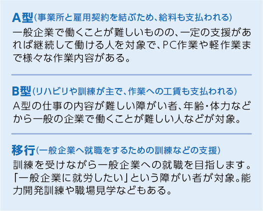 就労支援事業所の種類にはA型、B型、移行の3段階があり、当事者の目的に沿って選択することができます。