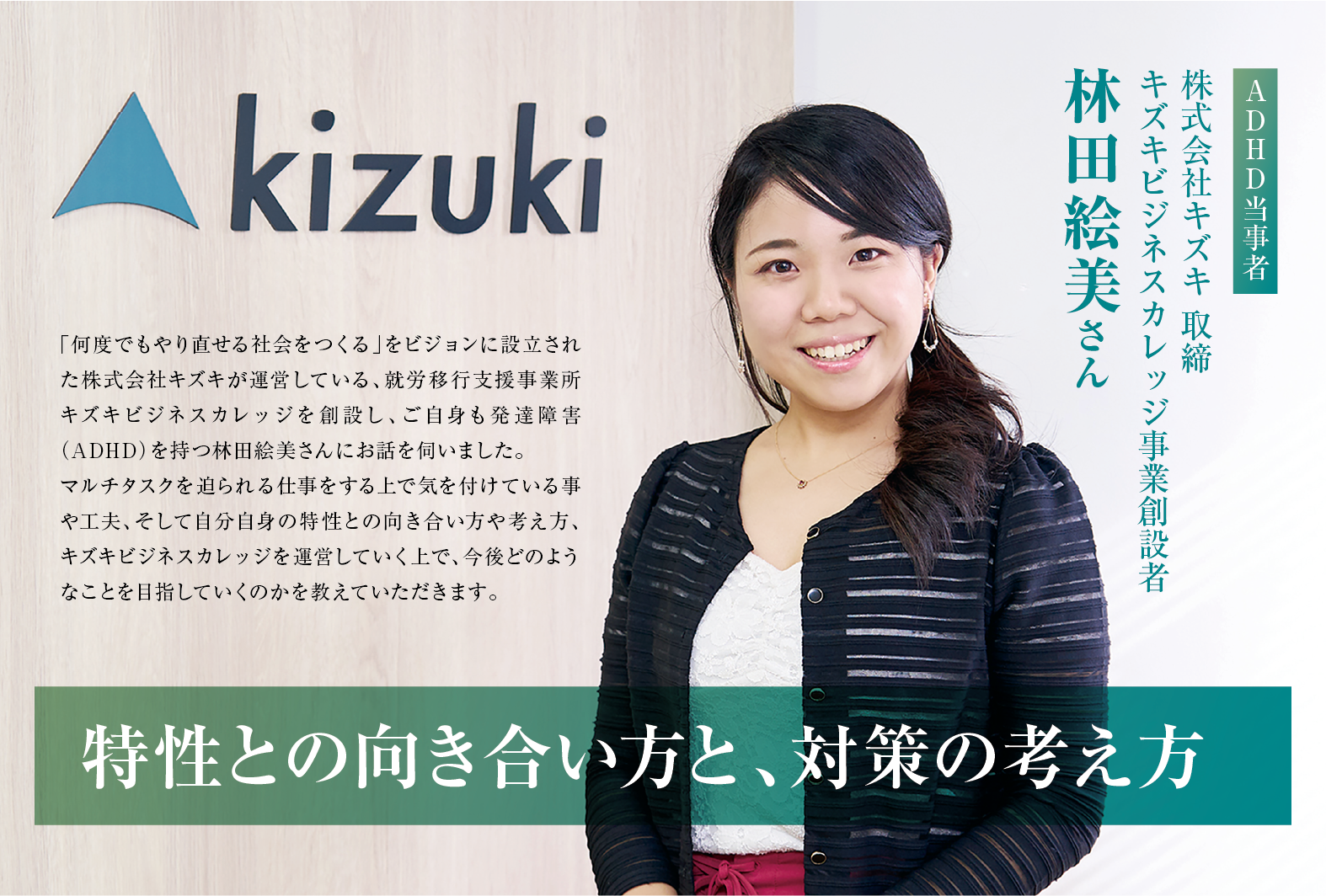 「何度でもやり直せる社会をつくる」をビジョンに設立された株式会社キズキが運営している、就労移行支援事業所「キズキビジネスカレッジ」を創設し、ご自身も発達障害(ADHD)を持つ林田絵美さんにお話を伺いました。