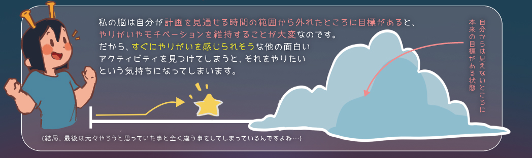 私の脳は自分が計画を見通せる時間の範囲から外れたところに目標があると、やりがいやモチベーションを維持することが大変なのです。