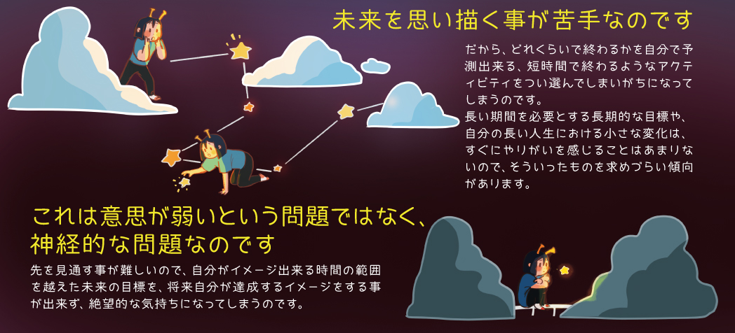 先を見通す事が難しいので、自分がイメージ出来る時間の範囲を越えた未来の目標を、将来自分が達成するイメージをする事が出来ず、絶望的な気持ちになってしまうのです。